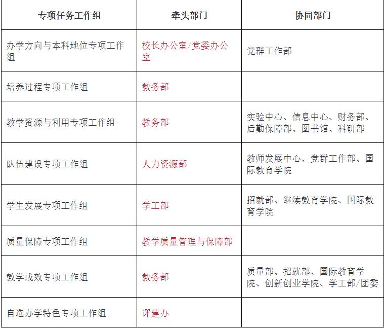 根据审核评估工作安排,学校自评报告及支撑材料建设工作由评建办公室牵头,按审核评估一级指标成立专项工作组,各工作组牵头部门具体负责各板块自评报告撰写和支撑材料的收集整理工作。专项工作组具体如下: